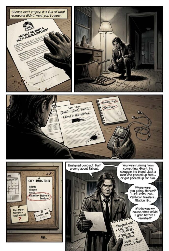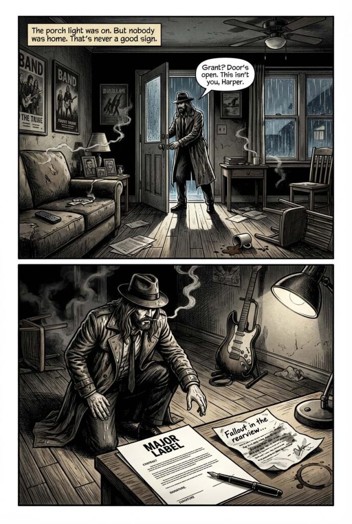 Between soundcheck and showtime, he trades his guitar for a trench coat. While the band thinks he’s “clearing his head,” he’s tailing suspects down rain-soaked alleyways. Questioning bartenders. Reading faces in smoky clubs. He solves the case just before curtain.